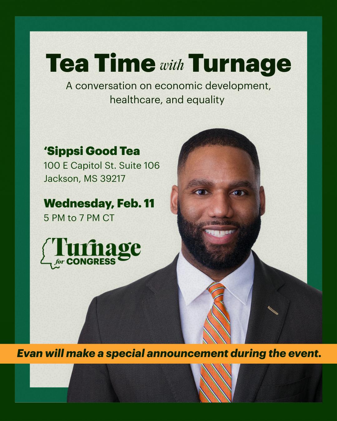 JACKSON, MS — Tomorrow, Wednesday, February 11th, antitrust lawyer Evan Turnage will host Tea Time with Turnage. With just a few weeks to go until the March 10th Democratic primary, the recurring campaign series will bring Evan’s vision for economic development, healthcare, and equality directly to voters across Mississippi’s Second District who are ready for change after living under the same leadership that has left their communities depleted for the past 33 years. During the event, Evan will make a special campaign announcement.